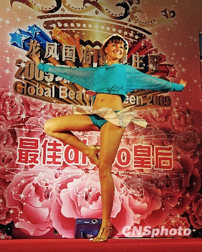 7月30日晚,由大庆龙凤国府湿地庄园主办的2009环球皇后世界大会大庆首场比赛Disco单项赛落下帷幕,来自世界各地近50个国家的58位选手参加比赛。图为表演中的俄罗斯佳丽。中新社发 滨海之光 摄