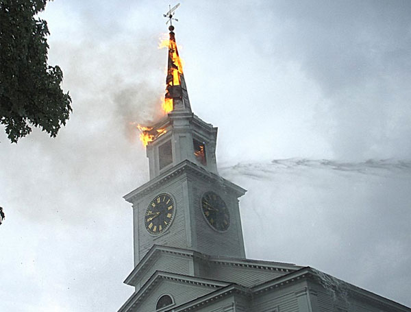 2009年7月1日,美国马萨诸塞州麦德威市190岁的教堂尖塔被闪电击中起火。但消防员及时扑灭了火势,尖塔只被烧损少许。