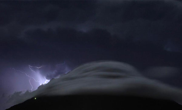 2009年7月4日,在危地马拉城,闪电划过安提瓜上的云哥火山。