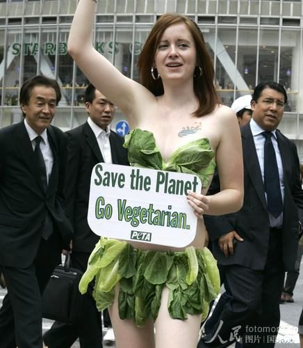 2009年8月3日,日本东京,日本动物保护组织成员在街头举行抗议活动,她们身着由生菜叶子制成的比基尼热辣服装,高举"拯救地球,转到素食”字样的标语在街头宣传。
