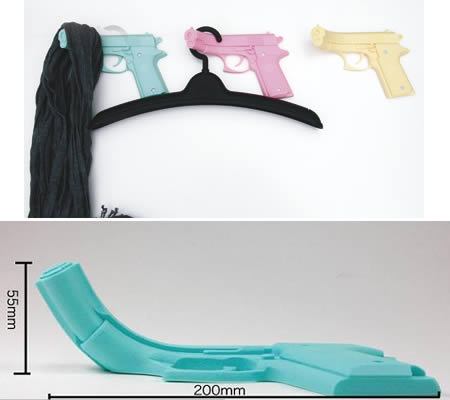 乍一看,墙上似乎粘贴了很多把玩具枪,因为它们有一定的弯曲度,所以形成了挂衣墙钩。枪墙钩有红、黄、绿三种颜色, 每一把卖17美元。