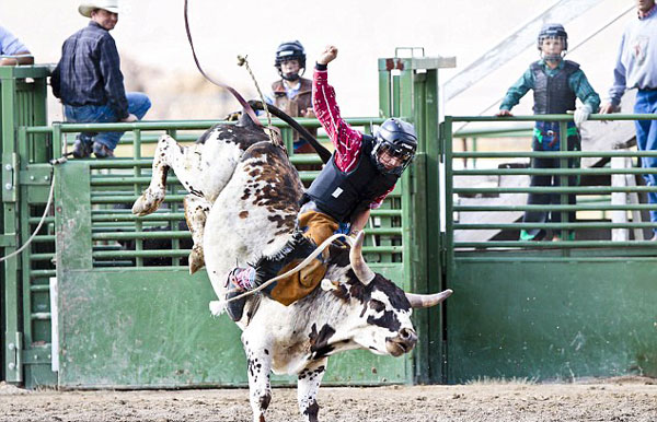 据英国媒体4日报道,美国爱荷华州的首府蒙彼利埃市近日举行了一场少年训牛比赛。全副武装的少男少女们尝试着在撒欢的小牛背上坐足8秒钟,虽然他们可能会以失败告终。