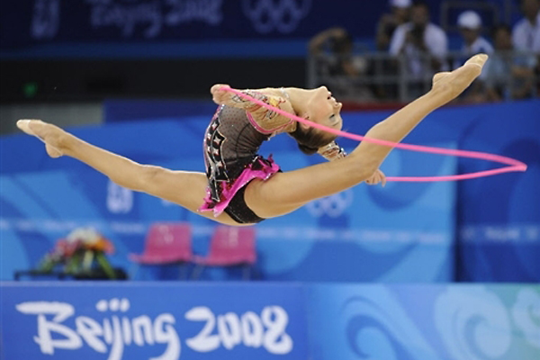 图为在北京奥运会艺术体操比赛中韩国选手的精彩动作。