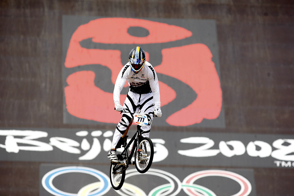 图为在北京奥运会的小轮车比赛中,一名选手高高跃起的瞬间。。
