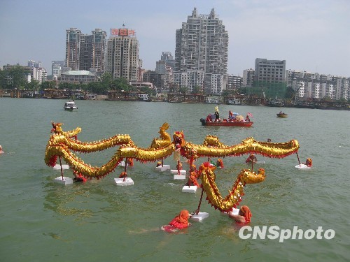 8月8日,中国首个“全民健身日”,广西柳州一万多市民游泳横渡柳江。该市在当日还组织“万人健身走”等形式多样的全民健身运动。图为市民水中舞龙渡江。中新社发 蒙鸣明 摄