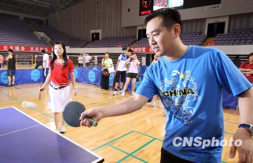 8月8日,一场全民健身日嘉年华活动在北京举行,乒乓球奥运冠军孔令辉为比赛开球。中新社发 张宇