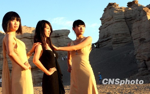日前,在新疆著名的名胜古迹雅丹地貌(魔鬼城),国际旅游小姐中国新疆赛区总决赛的佳丽身穿晚装和别具特色的古西域民族服饰展示风采。中新社发 钱兴强 摄