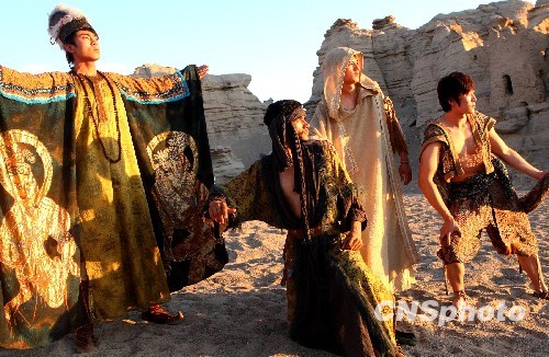 日前,在新疆著名的名胜古迹雅丹地貌(魔鬼城),国际旅游小姐中国新疆赛区总决赛的佳丽身穿晚装和别具特色的古西域民族服饰展示风采。中新社发 钱兴强 摄