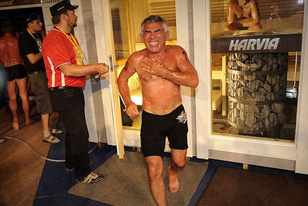 据英国媒体9日报道,8月8日,在芬兰南部城市黑诺拉举行了第11届桑拿浴世界锦标赛决赛。来自近20个国家的120余名选手参加了第11届桑拿浴世界锦标赛。选手们在110摄氏度的桑拿浴室内“蒸烤”,看谁坚持到最后。