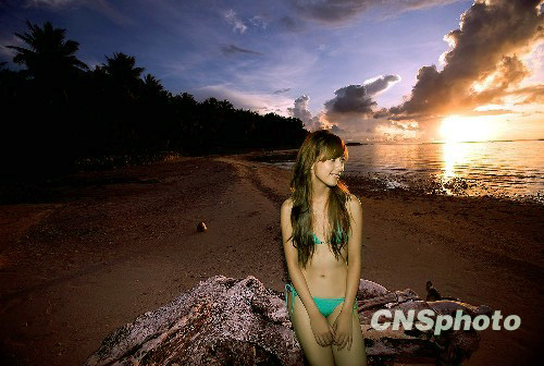 8月9日,海南,“超女”陈怡的最新海滩写真曝光。陈怡拍摄过程中穿着比基尼泳装,性感火辣身材一览无余。中新社发 AEG 摄