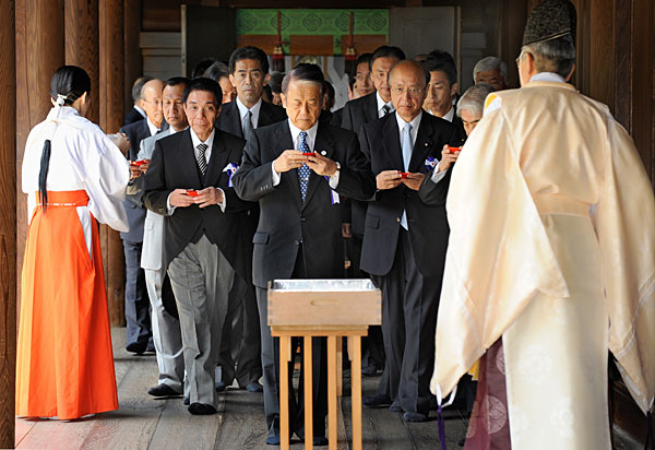 8月15日是二战日本投降64周年纪念日,日本约40名跨党派议员参拜靖国神社。其中自民党的两位前首相小泉纯一郎和安倍晋三也在今天参拜了靖国神社。日本右翼分子身着二战时期日军军装为战犯招魂。