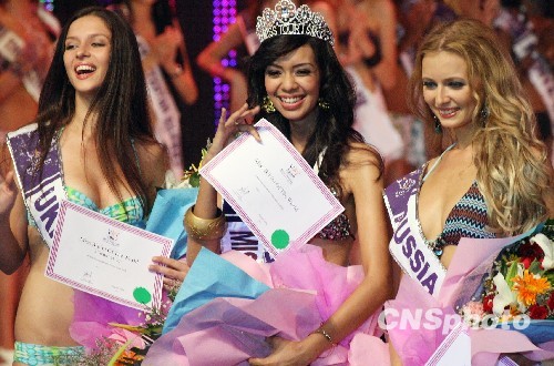 8月17日晚,来自120个国家和地区的2009国际旅游小姐冠军总决赛佳丽在河南信阳角逐世界比基尼小姐桂冠,来自巴厘岛的佳丽获得冠军(中)、来自俄罗斯的佳丽(右)获得亚军、乌克兰佳丽获得季军。中新社发 钱兴强 摄