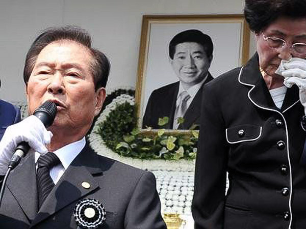 图为2009年5月28日,韩国,首尔:韩国前总统卢武铉的纪念仪式上,韩国前总统金大中回答记者提问。 图片来源:国际在线