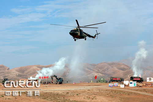 8月19日上午8时,随着三发绿色信号弹升空,在中国西北大漠戈壁,由解放军总后勤部组织的“卫勤使命-2009”实兵演习拉开了序幕。这是新中国成立以来,规模最大、参演兵力和装备最多,军地协同、多部门多兵种参加的,融战略筹划、战役指挥和部队行动于一体的非战争军事行动卫勤综合演习。陶宏祥摄