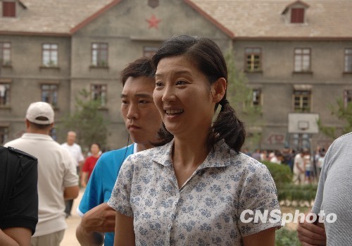 8月21日,冯氏新片《唐山大地震》首次开放在唐山外景地的媒体探班。耗资千万的场景按照历史照片打造,真实再现了70年代街景,群众演员也将达5万-8万人次。导演冯小刚、主演徐帆、张国强出现在片场。图为徐帆扎小辫穿花裙造型亮相。中新社发 李学仕 摄