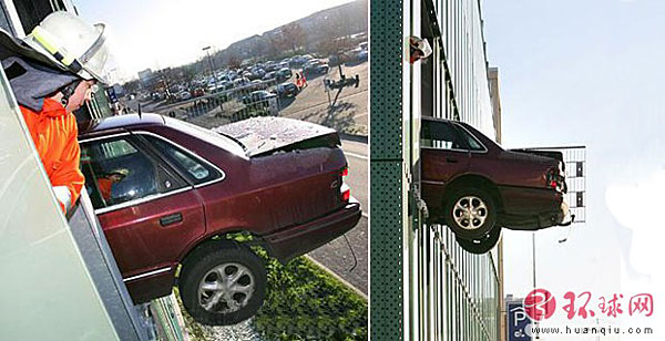 2007年1月23日,在德国北部的朗根哈根,一名消防员探头看一辆半截悬空在停车楼之外的轿车。当天,一名49岁的女司机在停车楼停车时可能因为将油门与刹车弄混而造成这次小意外。