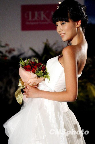 9月17日晚,来自中国各个分赛区的50名参加新丝路模特大赛的选手在海南三亚上演“2009婚尚潮流趋势发布会”。图为模特展示09新款婚纱系列作品。中新社发 钱兴强 摄