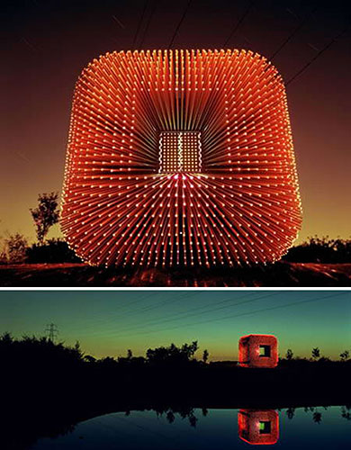 小屋“赛图特里”:曾获英国“菲利普王子奖”的建筑师托马斯-赫斯维克为国家罗盘星收藏协会设计的发光的铝质结构小屋“赛图特里”。这个立方体的建筑有五千个小窗户,它们都朝向这个立方体的中心。中心的一个光源使这些窗户发出橙色的光芒。