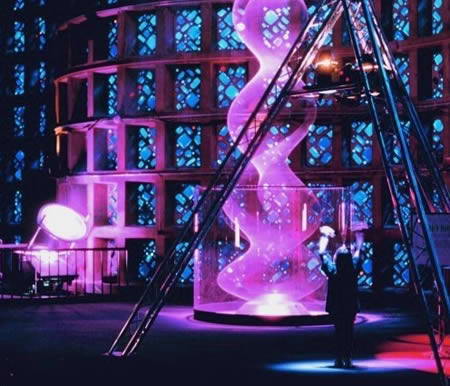 动态声光雕塑:这是一尊高7.5米的动态声光雕塑,人站在这个金字塔形的铁架之下,一举一动都会被被检测到,与此同时,雕塑也做出相应的互动。