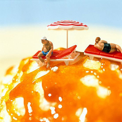 37岁的Akiko Ida和39岁的Pierre Javelle凭借杰出的想象,把食物跟玩偶制作成形态各异的风景图画。在巴黎的家庭工作室里,为了能够达到逼真和震撼的效果,这对摄影艺术二人组花费了数百小时,用极小的工具制作了“微型”系列。Akiko说,“如果回到童年,我会把各种食品都拍下来,然后在日志当中将他们进行分类”。