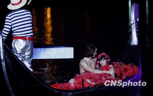 10月24日晚,皮尔·卡丹2010春夏时装发布会在北京举行,京城红领巾公园湖面上搭起的水中T台风格别样,图为模特在水中T台展示时装。 中新社发 钱兴强 摄