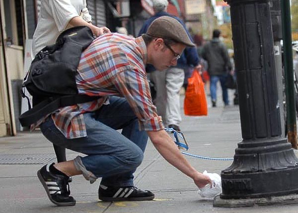 一名男子拿起塑胶袋,弯腰捡拾“不存在的便便”。