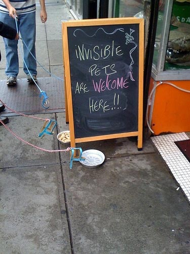 不过也有几家餐厅相当入戏,还在门口放水盆,标明欢迎隐形狗饮用,当然,也真有饲主带“它们”过去解渴哩!