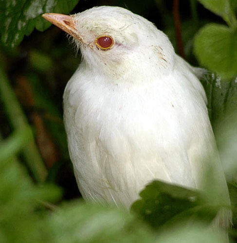 患了白化病的乌鸫,由于缺乏色素,患了白化病的动物许多眼睛也为红色。