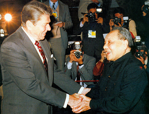 1984年(4月26日-5月1日),美国总统里根访华。图为邓小平亲切会见里根。 图片来源:新华网