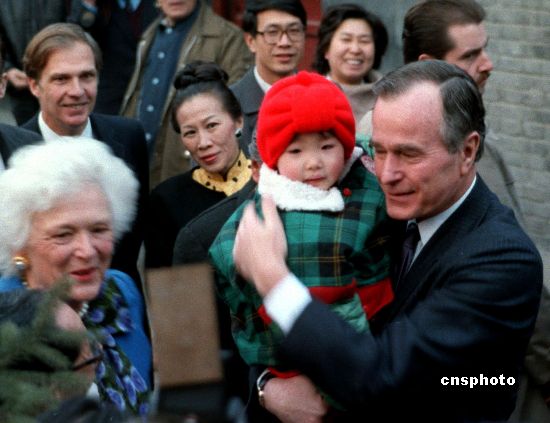 老布什与中国的渊源始于1974年,他在北京美国驻中国联络处待了13个月,就回国出任中央情报局局长去了。图为访华的美国总统布什夫妇,在崇文门基督教堂作礼拜时,抱起一名中国小姑娘。任晨鸣 摄