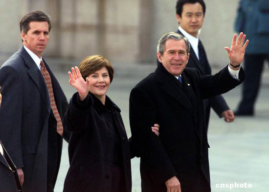 前后4次访华的小布什,曾与15位中国领导人会晤过,被称为“与中国最亲近的美国总统”。图为2002年2月21日,美国总统布什与夫人抵达北京首都国际机场,开始为期两天的工作访问。毛建军 摄