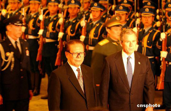 前后4次访华的小布什,曾与15位中国领导人会晤过,被称为“与中国最亲近的美国总统”。图为2002年2月21日,中国国家主席江泽民在北京人民大会堂举行仪式,与访华的美国总统布什检阅解放军三军仪仗队。贾国荣摄