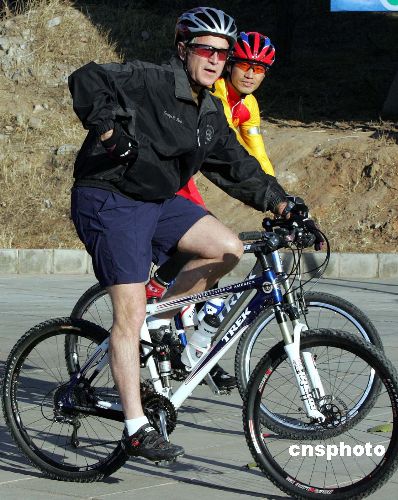 前后4次访华的小布什,曾与15位中国领导人会晤过,被称为“与中国最亲近的美国总统”。图为2005年11月20日下午,正在北京访问的美国总统布什与中国自行车运动员一起骑山地车,寻找当年在北京的骑车感受。布什总统曾经在一九七五年时骑车转遍北京城。中新社发 毛建军 摄