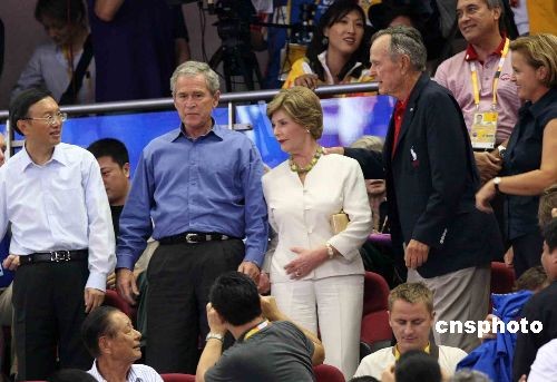前后4次访华的小布什,曾与15位中国领导人会晤过,被称为“与中国最亲近的美国总统”。图为2008年8月10日晚,美国总统布什夫妇、老布什夫妇观看中国男篮与美国“梦八队”之战。中新社发 任晨鸣 摄