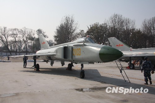 11月13日,北京沙河机场,中国自主研发的、参加国庆60周年首都阅兵的空警-2000型预警机、空警-200型预警机、轰油-6型加油机、轰-6H型轰炸机、歼-11、歼轰-7、教-8、红箭-12、红箭-9地空导弹武器系统发射车等空军主战装备一一排列,展示着中国人民空军发展壮大历史和战斗力发展新水平。图为歼-8D。中新社发 国刚 摄