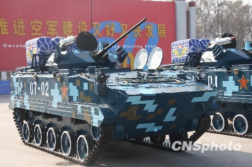 11月13日,北京沙河机场,中国自主研发的、参加国庆60周年首都阅兵的空警-2000型预警机、空警-200型预警机、轰油-6型加油机、轰-6H型轰炸机、歼-11、歼轰-7、教-8、红箭-12、红箭-9地空导弹武器系统发射车等空军主战装备一一排列,展示着中国人民空军发展壮大历史和战斗力发展新水平。图为伞兵战斗车。中新社发 国刚 摄