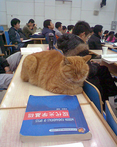 北大旁听猫:在北京大学校园里,有只猫5年来经常与学生一起听课,深受师生喜爱。这只肥猫,短毛无尾,近日风靡网络。身为流浪猫,原本有些身世飘零的凄惨味道,但这只猫却因酷爱“旁听”而被人们冠以“哲学猫”、“旁听猫”、“学术猫”等高雅头衔,并引得众多网友和北大学生的关注。它也因此成为一只不愁吃喝、广受喜爱,渐渐具有加菲猫特征的宠物猫了。(图片来源:京报网、金羊网)