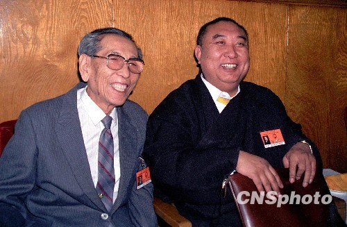 图为1988年,阿沛阿旺晋美和十世班禅大师在人民大会堂出席人代会时在休息厅交谈。 中新社发 吕相友 摄