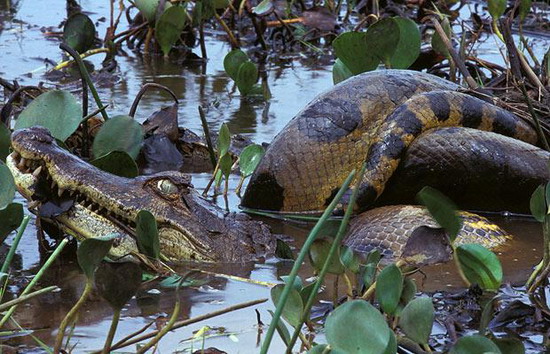 4.蟒蛇捕食鳄鱼:绿色的蟒蛇将鳄鱼先勒死,再开始吃,摄于委内瑞拉的里昂诺斯国家公园。