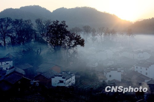 2010年1月14日晨,雨后转晴,江西婺源石城出现烟雾缭绕的美景,如同天宫浮云,海市蜃楼,一幢幢徽派古民居时隐时现,宛如仙境一般,如临神奇幻境。中新社发 方也广德 摄