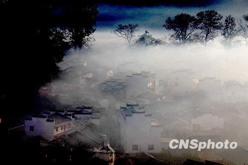 2010年1月14日晨,雨后转晴,江西婺源石城出现烟雾缭绕的美景,如同天宫浮云,海市蜃楼,一幢幢徽派古民居时隐时现,宛如仙境一般,如临神奇幻境。中新社发 方也广德 摄