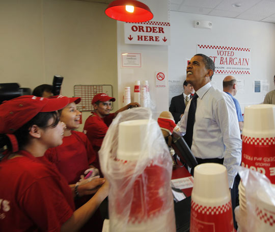 排队为员工买汉堡:当地时间2009年5月29日,美国总统奥巴马亲自到华盛顿一家连锁快餐店为白宫员工买汉堡。