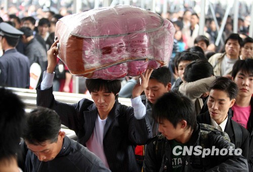 2010年1月20日离2010年春运还有10天,广州火车站迎来春运潮,以学生和农民工及探亲流为主的客流涌向广州火车站。针对春运潮的提前到来,广州铁路公安局和有关铁路部门积极应对,采取紧急予案,增调警力,引导和疏导旅客进站上车,确保广大旅客平安出行。中新社发 丁勇 摄