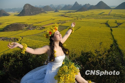 2月4日,“网络红人”芙蓉姐姐到达云南省罗平县,直奔80万亩油菜花海拍摄个人写真。中新社发 鲁啸天 摄