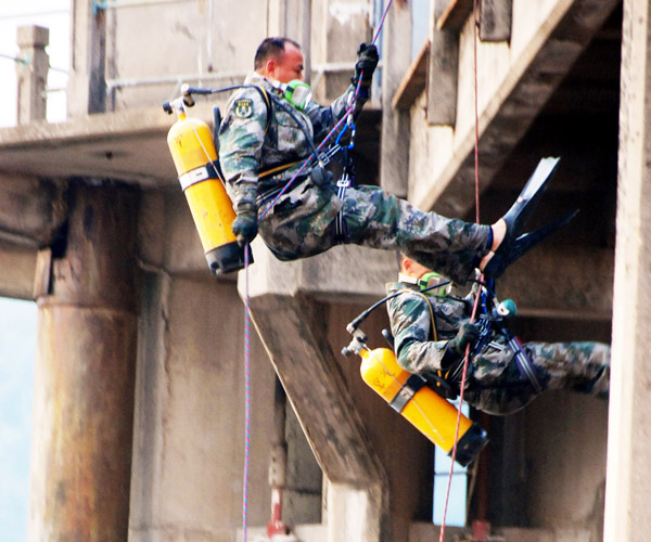 何祥美背负轻潜水装具准备“离机”。徐军刚 摄
