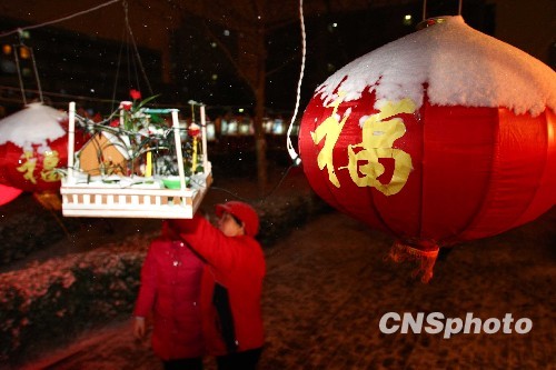 农历正月十五元宵节,从当日傍晚开始,阴沉了一天的北京天空飘起细密的雪花,雪花伴着彩灯,使北京的元宵夜出现了“雪打灯”景象。图为在北京安贞社区的民众,冒雪组织了一场属于他们自己的灯会。中新社发 富田 摄