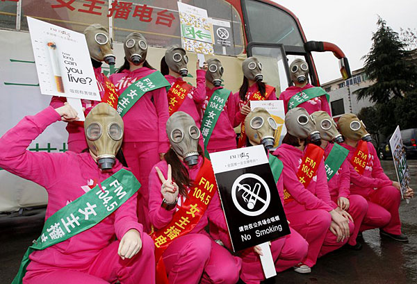 3月1日,杭州一家电台的12位美女主播头戴防毒面具,手举禁烟标识,走上街头,用这种夸张的方式提醒广大烟民:为了自己和他人的健康,请不要在公共场所吸烟。董旭明/CFP