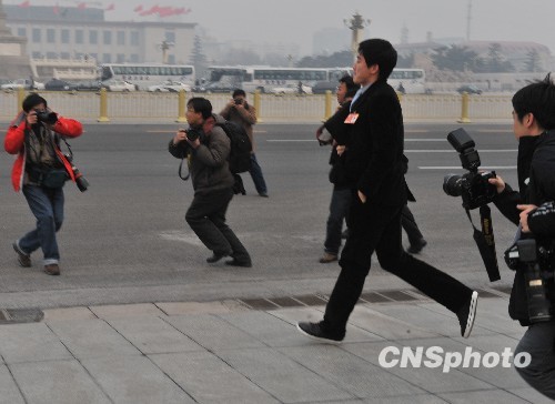 3月3日下午,全国政协委员刘翔出席全国政协十一届三次会议开幕式后,作为最后一位离场的委员,跑步离开北京人民大会堂去乘专车回驻地。中新社发 贾国荣 摄