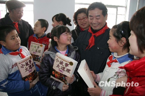 3月4日,辽宁丹东六道街道青年团员和校外辅导员,为六合小学雷锋中队的农民工子女送去学习书籍,用社会的关爱鼓励这些“小雷锋”们。中新社发 陈浩浩 摄