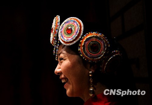 3月7日,来自云南的纳西族女代表杨劲松参加十一届全国人大三次会议云南代表团全体会议,会议间隙接受记者采访时她说“此次会议她提交了文化产业的相关议案,期待丽江古城这样的景点能够返璞归真。”中新社发 廖攀 摄